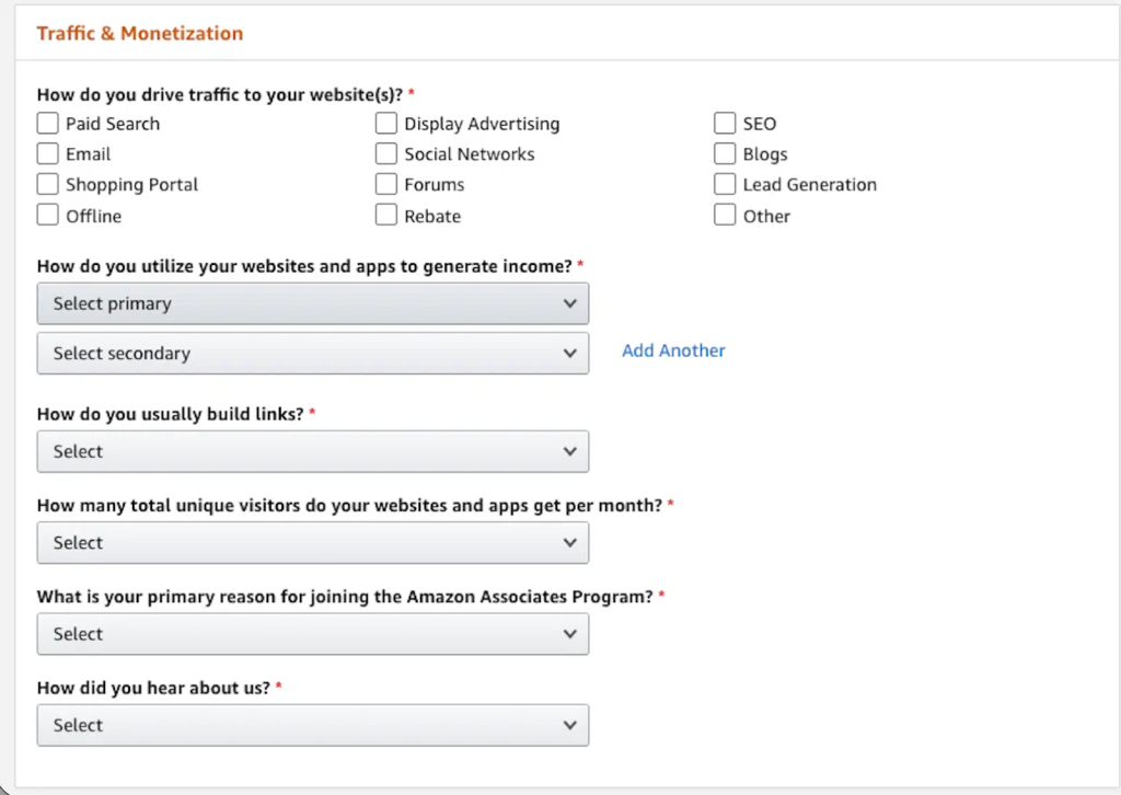 Amazon then asks how visitors find your content. You’ll select traffic sources such as search engines, social media, email, or paid advertising, and provide a snapshot of your audience size and monetization strategy.