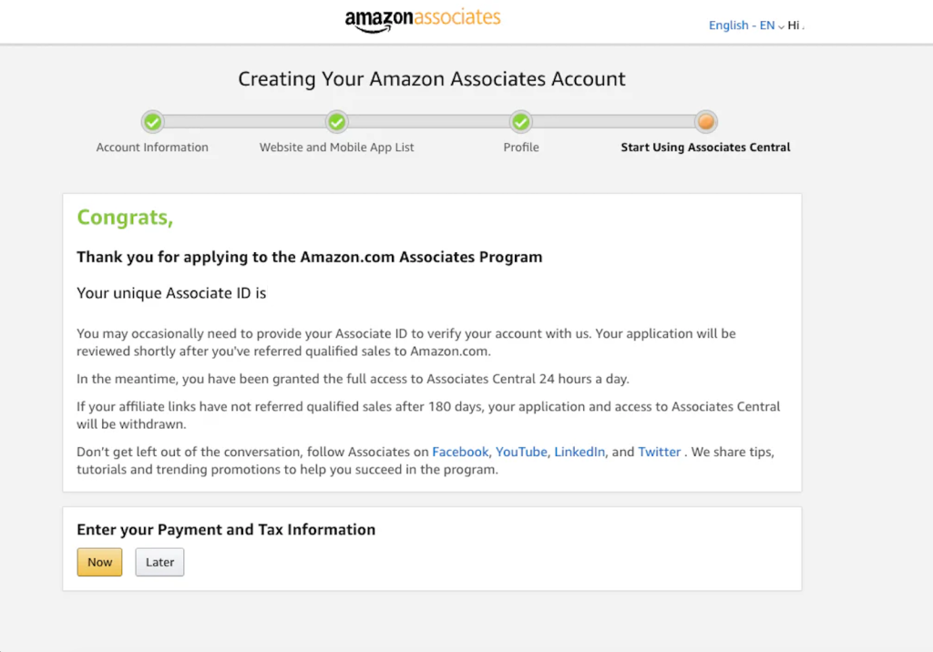 Once the application is complete, affiliates submit tax details and choose a payout method. Available options typically include direct deposit, Amazon gift cards, or mailed checks.